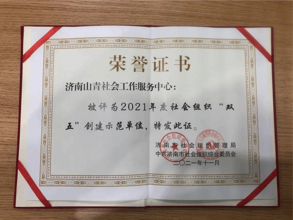 为贯彻落实新时代党的建设总要求,强化社会组织的战斗堡垒作用,12月3日上午,由济南市社会组织管理局组织的2021年度市管社会组织登记评估暨“双五”创建示范单位授牌大会在龙奥大厦召开,济南山青社会工作服务中心被评为2021年度“五A”社会组织和“五星”社会组织党组织创建示范单位。