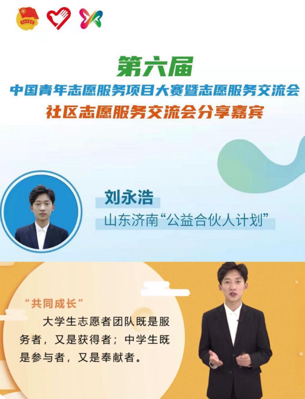 12月3日,第六届中国青年志愿服务项目大赛暨2021年志愿服务济南交流会(以下简称“志交会”)正式拉开帷幕。本届志交会以“志愿新时代,共筑中国梦”为主题,由共青团中央、中央文明办、民政部、水利部、文化和旅游部、国家卫生健康委员会、中国残疾人联合会和中共山东省委、山东省人民政府共同主办,共青团山东省委、中共济南市委、济南市人民政府承办。我校师生受邀在服务黄河国家战略,助力黄河流域生态保护和高质量发展青年志愿服务交流会上做专家发言,在全国社区志愿服务示范项目团队交流会上分享交流,参与录制“志交会”专题MV,以多种形式参与志愿盛会,展现山青风采。