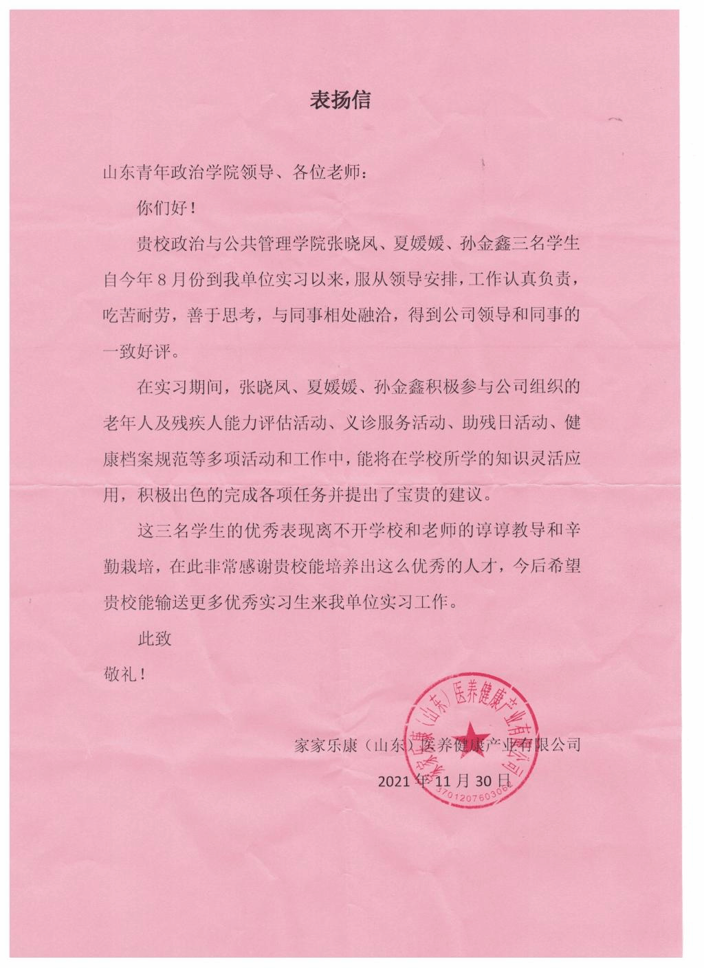 在为期16周的实习过程中三名同学专业认同度高,环境适应能力快,专业技能运用得当,体现了一名专业社工人的职业素养。三名同学在公司领导和指导教师的共同培养下快速成长,提高自身专业技能与技巧,实习工作表现突出。在各自部门和工作岗位能独当一面,受到用人单位和服务对象的高度评价与认可。11月30日,家家乐康(山东)医养健康产业有限公司寄来感谢信,信中特别提出对孙金鑫、夏媛媛、张晓凤同学在工作中能将专业知识灵活运用于服务,积极出色完成各项任务,服务细致周到的赞扬。并感谢学校和老师的辛勤栽培。