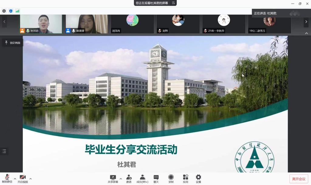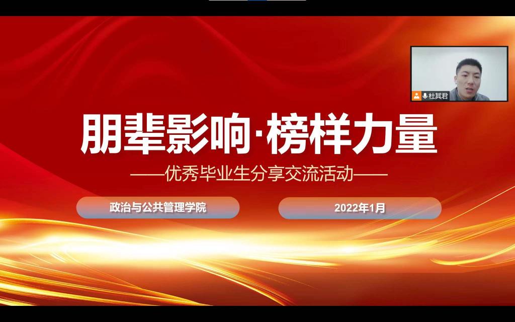 为帮助同学们树立专业认知、强化专业认同感,加强学风建设,营造浓厚的学习氛围,充分发挥优秀毕业生的榜样作用,根据校团委相关要求,2022年1月9日,政治与公共管理学院开展“朋辈影响·榜样力量”优秀毕业生分享交流活动,本次活动特别邀请到2014级政治学与行政学专业毕业生杜其君为大家分享,活动由学院辅导员杨漫漫主持。