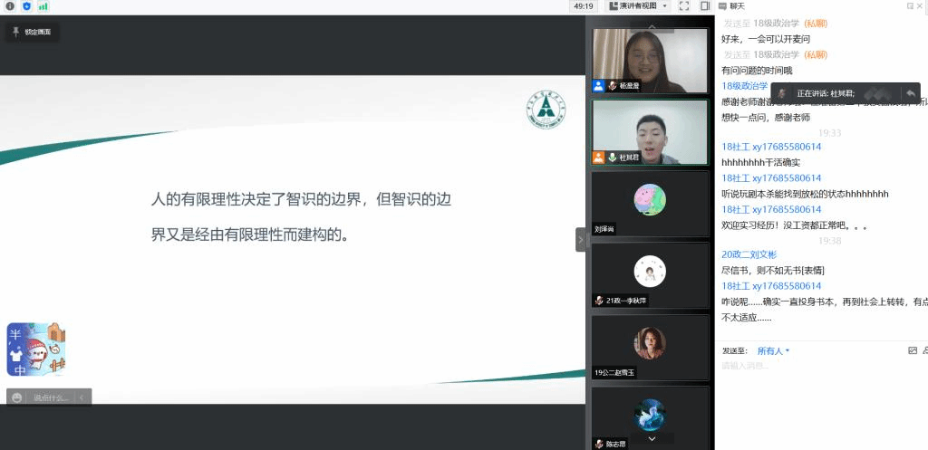 在经验分享阶段,杜其君从本科学习,考研经历以及人生感悟三个方面进行分享。在本科学习期间,他认为要做好积累,认真读书,多涉猎专业书籍,积极与老师交流;要多参与学生活动,锻炼自己的人际交往能力;要养成良好的健身和睡眠习惯。在考研方面,他建议文科专业的同学要早树立目标,尽早开始进行背诵方面的复习,这样,相较于其他同学,进度较快,根基较稳。对于复试,他认为有四点需要把握,即“谨慎一点,灵活一点,自信一点,吃好一点”,保持良好的复试状态。最后,杜其君向学弟学妹们分享了自己的一些人生感想,叮嘱大家珍惜时间,有意识的锻炼自己的思维,多提问,并在此基础上培养逻辑表达能力。在提问环节,杜其君对同学们提出的关于考研心态、本科与硕士生活的区别等多个问题进行了耐心、细致的解答。