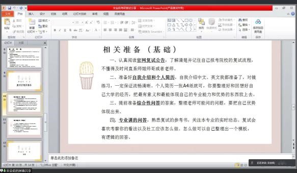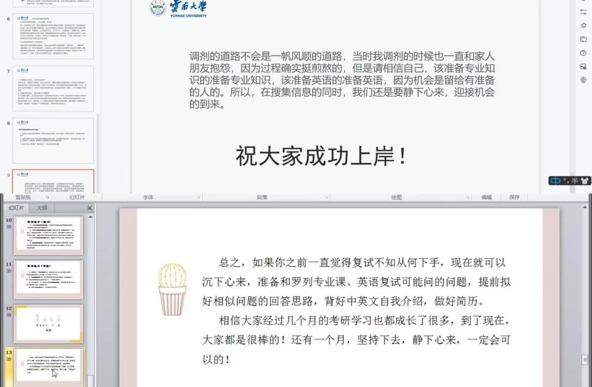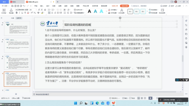 首先,考取中国社会科学院大学的宋金茹同学从复试的基本常识、基本流程、相关准备等三方面为大家分享自己的经验,提醒大家在当前疫情防控形势下参加线上复试的相关技巧及应该注意到的面试仪态等问题,建议同学们在准备复试的过程中关注相关专业时事热点。随后,考取云南大学的贺洪康同学侧重向大家分享了调剂成功的经验,针对调剂过程中的心态调适、有效获取调剂院校信息等问题进行了详细的讲解,同时,他还结合自己的经验介绍了一些的复试方法和技巧,并主动收集了身边考研成功同学的经验,给同学提供了更多的参考,叮嘱大家调整好心态,积极行动。最后,学长学姐对学弟学妹们给予了美好的祝愿和殷切的希望。