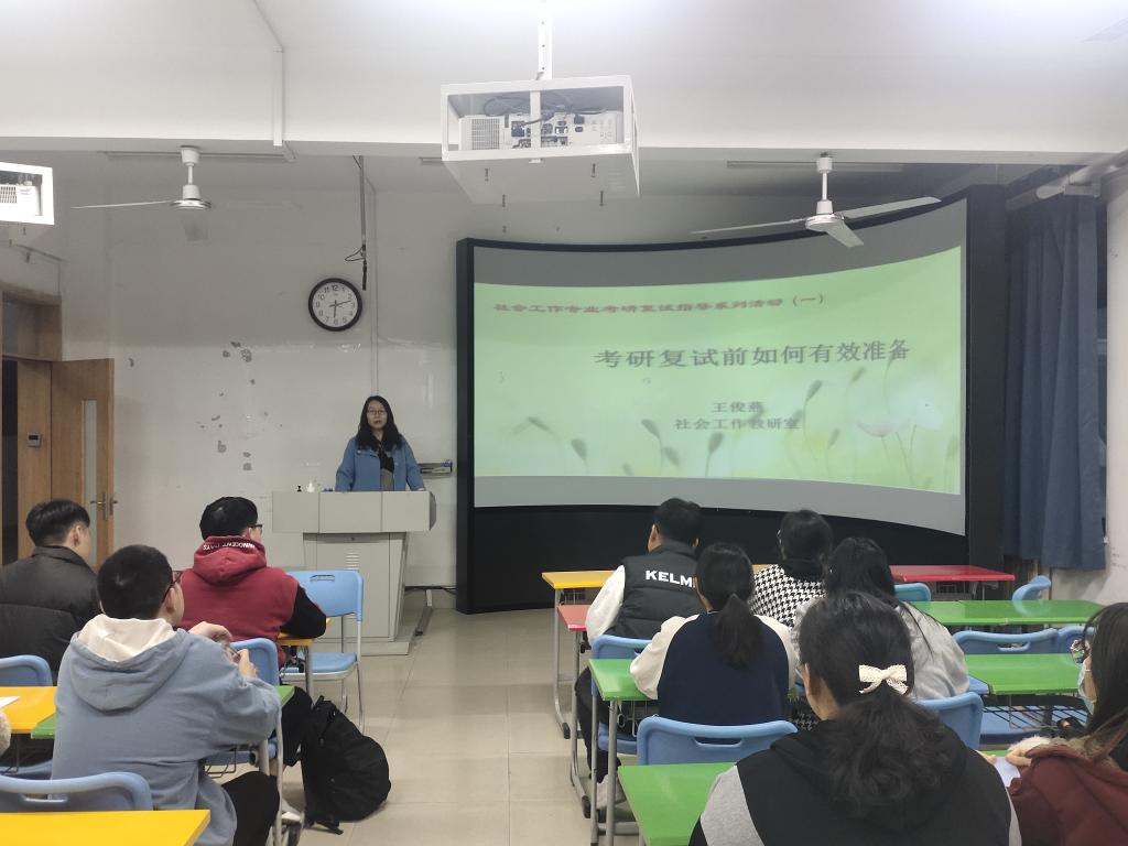 会上,王俊燕老师首先为同学们大致介绍了近年来考研国家线的划定情况,结合部分学校的复试方式和往年情况,通过多个案例鼓励所有有复试和调剂机会的学生调整心态,积极准备。接着,她提出要有效做好各项准备工作,做到“兵来将挡、水来土掩,充实自己、完善自己”,主要包括整理好有关院校研招办电话、联系考研目标院校师哥师姐、多向考研成功的“前辈”请教、清楚复试方式并加强复试相关内容的准备性复习等。有关近期复习,她强调要充分复习理论、总结实践经验,同时关注时政热点和政策,理清时代脉络,把握时代脉搏,关注社工行业领域最新发展。此外,她还就如何制作简历,如何平衡考研复试和毕业论文撰写的关系几个方面进行了讲解,鼓励同学们不轻言放弃,抓住一起可能机会。最后,王老师表示社会工作教研室所有教师将和同学们一起集中力量、集中精力,齐心协力为复试工作而努力。