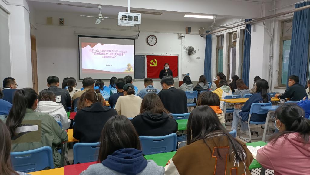 为更好地传承中华优秀传统文化,涵养党员文化素养,提升党性修养,3月11日晚,政治与公共管理学院学生第一党支部开展“弘扬传统文化 聆听大舜故事”主题党日活动,邀请大舜文化志愿宣讲团进行舜文化宣讲,活动由学院学生第一党支部书记杨漫漫主持,支部全体党员和积极分子参加。
