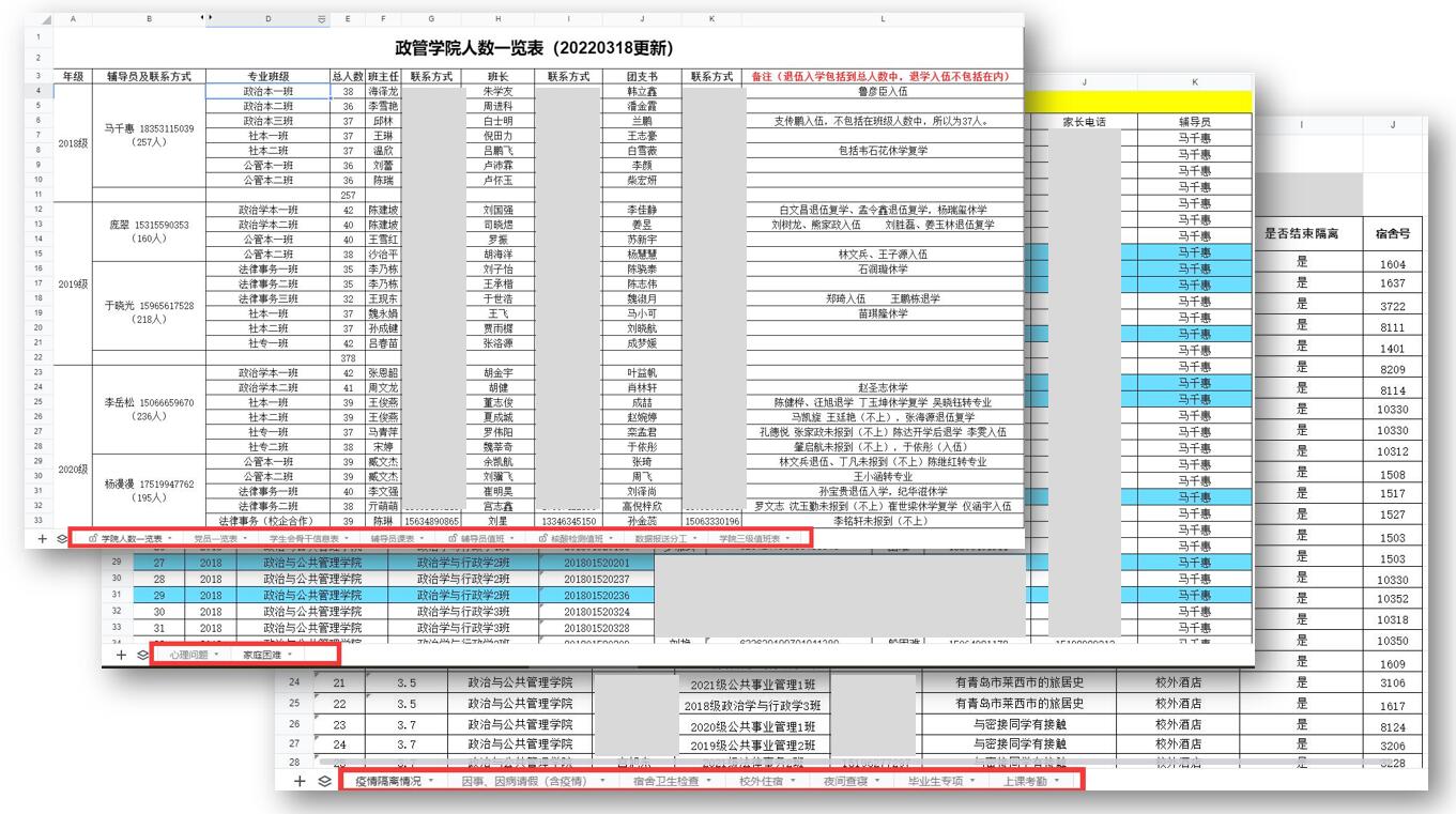 为打破学院学生管理数据孤岛,解决疫情期间分管领导、教师、班主任、辅导员以及学生骨干之间对于学生信息了解不及时不全面的潜在风险,学院打造了学院学生安全数据协同管理表格,将心理问题、困难学生、因病缺勤、晚间查寝、疫情防控以及学院基础学生数据等实时全面呈现在一个线上管理表格当中,确保学生隐私的同时保证管理人员都能实时了解和更新当前学生情况,打破各学院管理角色对于学生安全信息的隔阂,织密筑牢校园疫情防控网。