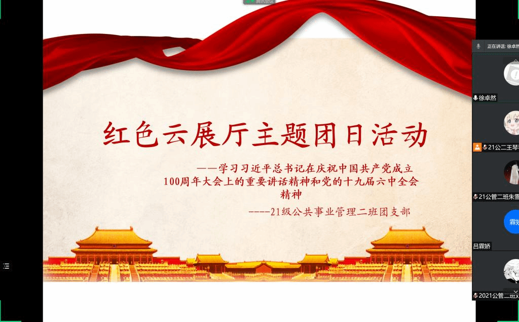 为深入学习贯彻习近平总书记在庆祝中国共产党成立100周年大会上的重要讲话和党的十九届六中全会精神,进一步推动党史学习教育向纵深发展,近日,政治与公共管理学院通过线上会议形式开展了“红色云展厅”进山青主题团日活动,全体团员青年参加了此次活动。