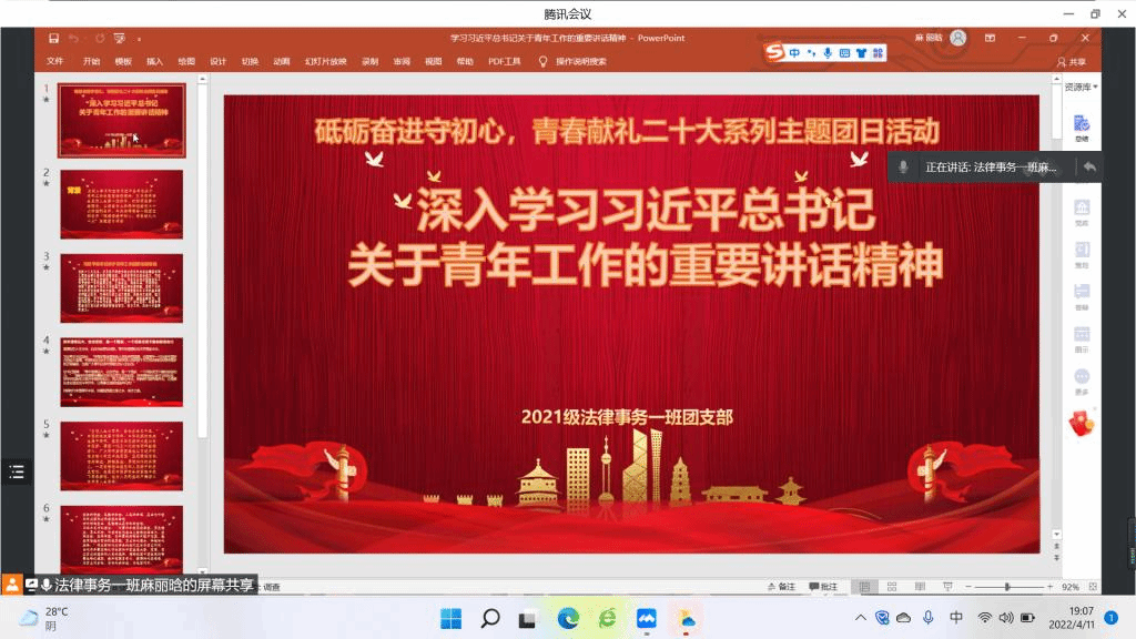 为引导青年学生系好人生第一粒扣子、打好青春第一场硬仗,以奋发向上的精神迎接党的二十大胜利召开,根据学校团委的相关要求,政治与公共管理学院开展“砥砺奋进守初心,青春献礼二十大”系列主题团日活动,本次团日活动以习近平总书记关于青年工作的重要讲话精神为主题,开展线上深入学习和讨论,全体团员青年参加。