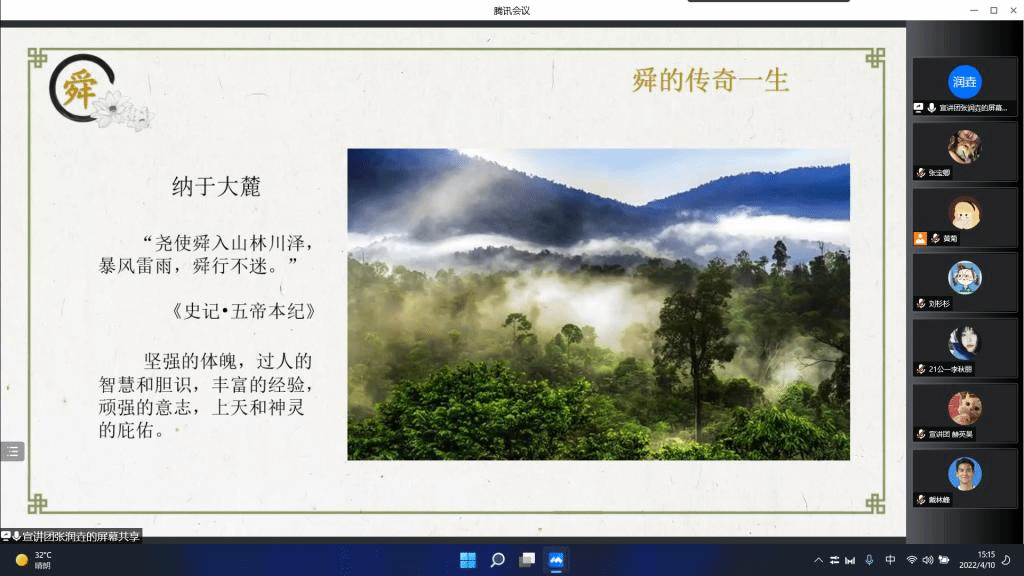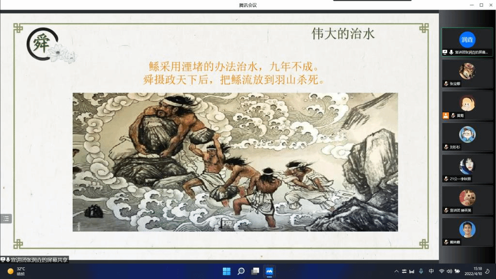 为更好地传承中华优秀传统文化,提升大学生文化自信和文化认同感,增强青年学生节水爱水的理念,4月10日下午,公共管理协会于线上开展“传承大舜精神 传播节水理念”主题活动。活动邀请山东青年政治学院大舜文化宣讲团成员讲述了舜的传奇一生和舜治水的故事,将新时代节水爱水理念与大舜治水的故事相融合,为同学们带来了一场生动的文化盛宴。