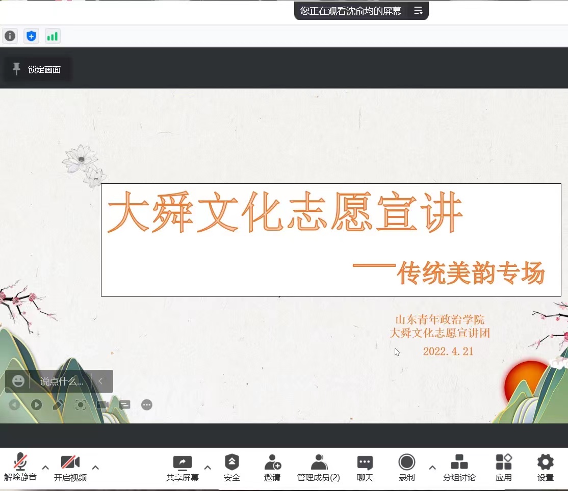 为更好地传承中华优秀传统文化,引导学生充实精神资源,让更多的人感受大舜文化的魅力,近日,大舜文化志愿宣讲团面向传统美韵协会开展了线上宣讲活动。