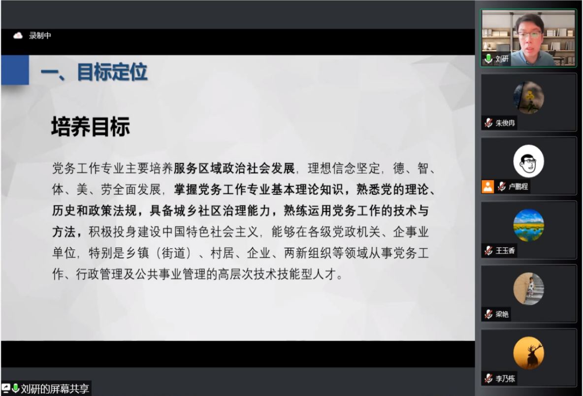 研讨会开始,两个职教本科专业分别汇报了前期开展的相关工作及对专业人才培养目标定位的认识。党务工作教研室主任刘研提出,专业在职业教育学院前期坚实工作基础上,结合学院办学定位和培养对象的变化,对人才培养目标与部分课程设置进行了调整,党务工作专业主要培养服务区域政治社会发展、掌握党务工作专业基本理论知识的高层次技术技能型人才。法学教研室主任李乃栋围绕法律行业人才需求情况、法律人才培养目标与课程设计、法律专业发展规划等方面,提出法律专业立足于适应法律实务领域优化升级的需要,培养符合基层社会治理需要、适应信息技术发展的高层次法律技能人才。