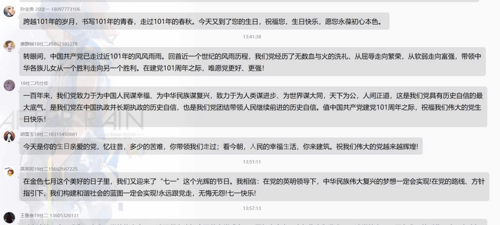 在讨论阶段,学生党员孙宝贵谈到,身为青年党员,由衷的钦佩这些平民英雄无私无畏、为国为民的精神,正如电视剧《功勋》所传递的——“一个有希望的民族不能没有英雄,一个有前途的国家不能没有先锋”,那些默默无闻、无私奉献的先锋们,向他们致敬!学生党员王甜雨说,作为一名学生党员,在日常生活中要时刻发挥一个共产党员的先锋模范作用,勤俭节约,艰苦奋斗。作为青年一代,更要掌握好马克思主义,坚定正确政治方向,坚定跟党走,积极投身到新时代中国特色社会主义伟大事业,在实现中国梦的生动实践中放飞青春梦想,在为人民利益的不懈奋斗中书写人生华章。讨论结束后,学生党员纷纷献上祝福,愿党永葆青春,愿祖国昌盛繁荣。