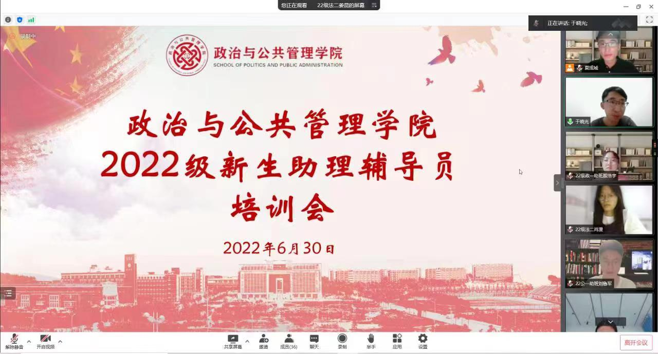 为全面做好2022级新生入学相关工作准备,提高班主任助理在新生入学阶段时的综合服务能力,近日,政治与公共管理学院在线上举办了2022级班主任助理培训会,会议由辅导员于晓光主持,全体班主任助理参加。
