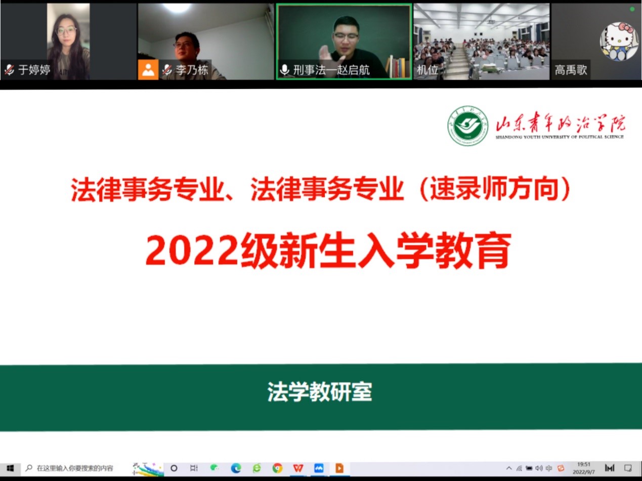 为帮助2022级新生尽快适应大学生活,深入了解所学专业,尽快为未来的学习和生活做好规划,9月7日,法学教研室线上线下相结合,在腾讯会议室、笃行楼412教室组织法律事务专业、法律事务专业(速录师方向)2022级新生专业入学教育和师生见面会。会议由法学教研室主任李乃栋主持,教研室全体老师、法律事务专业优秀学长学姐、2022级法律事务专业、法律事务专业(速录师方向)全体学生参加。