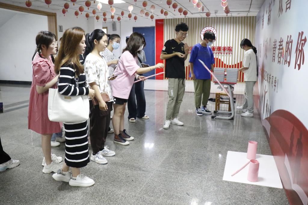 在“校史知多少”这一活动环节,同学们迫不及待地摘取悬挂着的校史卡片,或自己独立思考,或几个人一齐讨论,共同根据卡片上的题目讨论正确答案。紧接着,回答正确的同学来到最后一关——“投壶拜中秋”的场地进行投壶活动。顺利完成四轮闯关同学欣喜若狂,纷纷前往志愿者处依据所集得的印章数兑换相应奖品。