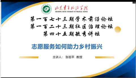 9月8日下午,由山东青年政治学院科研处、山东省志愿服务研究基地主办,政治与公共管理学院、山东省社区发展与社会工作研究中心、国际问题研究院承办的第一百七十三期学术前沿论坛、第一百二十三期社区治理论坛、第四十五期毓秀讲坛通过腾讯线上会议的形式举行。上海海洋大学公共管理系主任、博士生导师张祖平教授应邀做了题为《志愿服务如何助力乡村振兴》的学术报告。本次论坛由政治与公共管理学院院长王玉香教授主持,学院部分师生参加。
