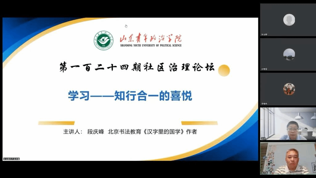 9月9日下午,由政治与公共管理学院主办,山东省社区发展与社会工作研究中心承办的第一百二十四期社区治理论坛线上开讲。中国语文现代化学会会员,中央数字电视书画频道特聘讲师段庆峰应邀作了《学习——知行合一的喜悦》的专题讲座。本次论坛由政治与公共管理学院副院长张剑教授主持,政治与公共管理学院部分师生参加。