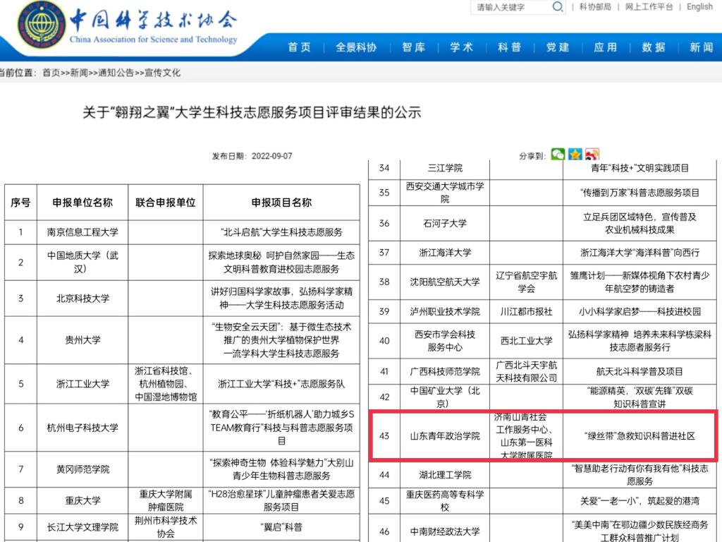 近日,中国科学技术协会举办的关于“翱翔之翼”大学生科技志愿服务项目评审完毕并公布入选名单。政治与公共管理学院申报的“‘绿丝带’急救知识科普进社区”项目在来自全国245家相关申报单位中脱颖而出,获批中国科学技术协会2022“‘翱翔之翼’大学生科技志愿服务项目”立项,获得资助8万元。