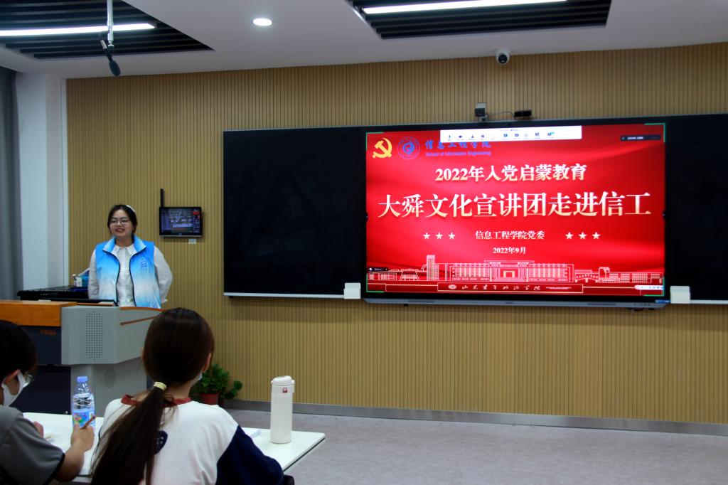 为更好地传承中华优秀传统文化,丰富新生入党启蒙教育形式,近期,舜文化宣讲团成员走进信息与工程学院进行舜文化宣讲,引导学生了解悠久的历史文明,纪念伟大的英雄祖先,弘扬中华优秀传统文化,为实现中华民族伟大复兴而努力奋斗。