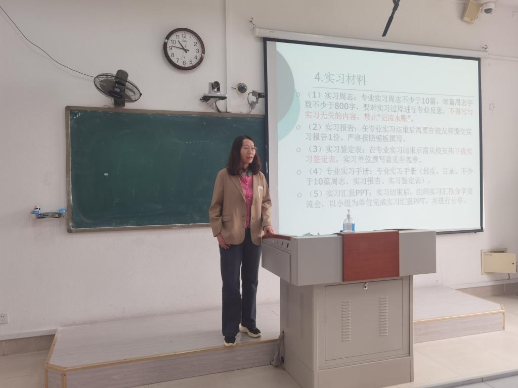 宋婷首先介绍了专业实习的时间安排与材料汇报等方面的问题,就具体任务安排、实习材料填写等做了详细的说明,她建议同学们要明确实习内容、把握时间节点、重视实习效果、规划未来发展,认真对待本次实习。