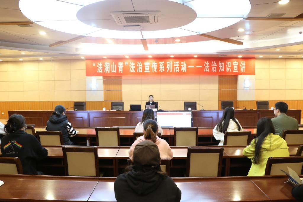 为深入学习贯彻党的二十大精神,全面落实依法治校方略,进一步强化学校法治工作,引导广大青年学子树牢法治信仰,增强法治意识,由学生工作处、团委主办,政治与公共管理学院承办的“法润山青”法治宣传系列活动——法治知识宣讲活动于11月4日上午在图书馆学术会议厅开讲。讲座特邀山东省济南市历下区人民法院立案庭副庭长罗琳与政治与公共管理学院法学教研室教师赵启航作专题报告,政治与公共管理学院党委副书记王正坤主持,山东亚速信息技术有限公司总经理张福受邀出席,各学院师生通过线上线下相结合的方式聆听讲座。