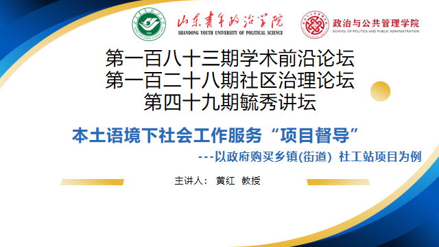 11月23日下午,由山东青年政治学院科研处、山东省志愿服务研究基地主办,山东青年政治学院政治与公共管理学院、山东省社区发展与社会工作研究中心、山东青年政治学院国际问题研究院承办的第一百八十三期学术前沿论坛、第一百二十八期社区治理论坛、第四十九期毓秀讲坛于腾讯会议线上举行。黑龙江省社会科学院社会学所所长黄红教授应邀作主题为《本土语境下社会工作服务“项目督导”—以政府购买乡镇(街道)社工站项目为例》的学术报告。本次论坛由政治与公共管理学院院长王玉香教授主持,学院部分师生参加。