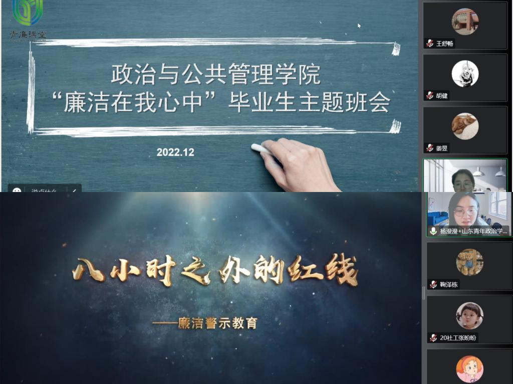为进一步加强廉洁校园建设,帮助毕业生养成廉洁自律、诚信做人,文明守法的良好品德,培育学生正确的价值观和高尚的道德情操,近期,政治与公共管理学院举行“廉洁在我心中”毕业生主题班会,本次班会由学院各毕业班辅导员主持。