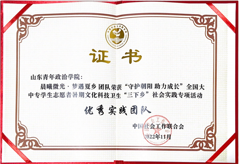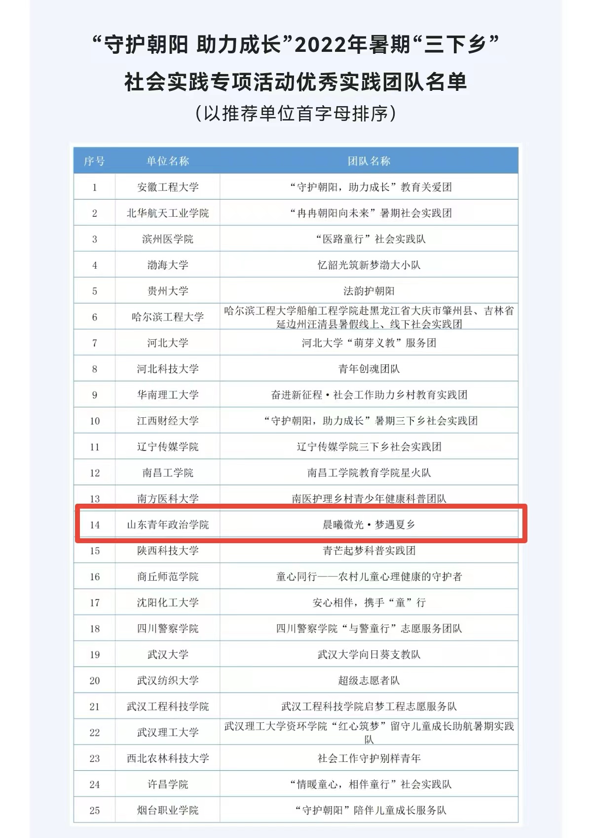近日,共青团中央青年发展部发布了2022年全国大中专学生志愿者暑期文化科技卫生“三下乡”社会实践活动总结通报结果公示,其中,“守护朝阳 助力成长”2022年暑期“三下乡”社会实践专项活动共有来自219所高校的858支实践团队参与申报,遴选100支全国高校团队参与实践,经过成果收集汇总及专家团评审,最终评选出25支“优秀实践团队”,我校政治与公共管理学院晨之曦社工协会“晨曦微光·梦遇夏乡”实践团脱颖而出,成功入选优秀实践团队。
