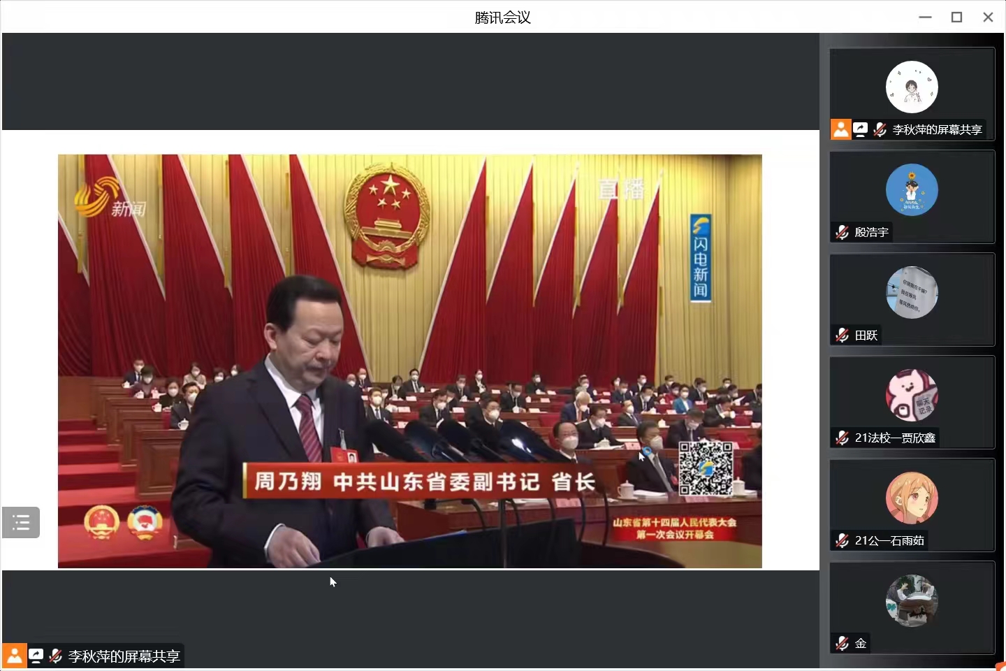 模拟政协协会秘书组负责人 石雨茹:今天上午我们收看了周乃翔省长在山东省第十四届人民代表大会第一次会议上作《政府工作报告》。呈现在我们面前的是一份发展路径清晰、为民情怀深厚、鼓舞人心斗志的报告。我也将制定阶段性目标,不断学习,努力提高自己的专业知识、业务知识和政治思想素养。