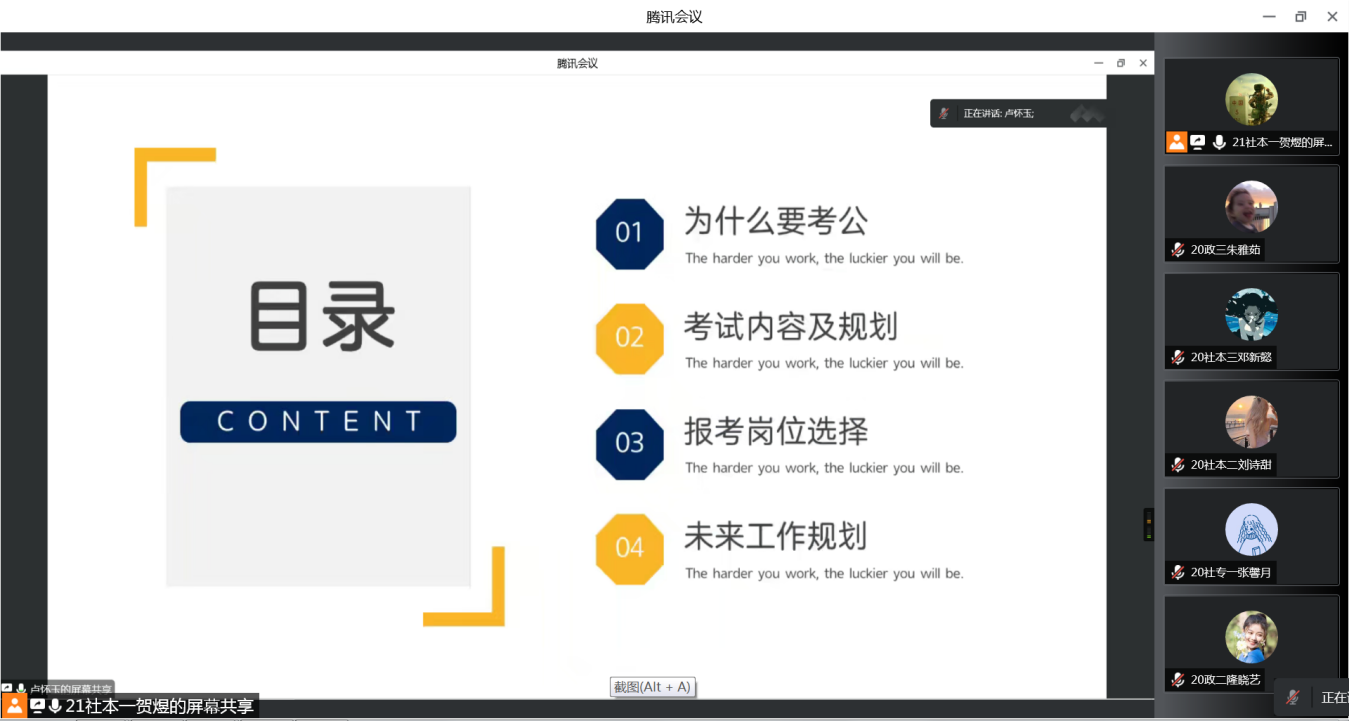 卢怀玉结合自身经验从为什么要考公、考试内容及规划、报考岗位选择、未来工作规划四个部分进行分享。他谈到,报考应该根据自己的学习情况、就业规划、内心想法来判断自身的考公情况,不要盲目报考,同时在备考时也应该从自身专业出发,制定一套可执行的规划,尽量做到专业与岗位对口。此外,他从考公、考研、求职等方面给同学们提供了有效建议。