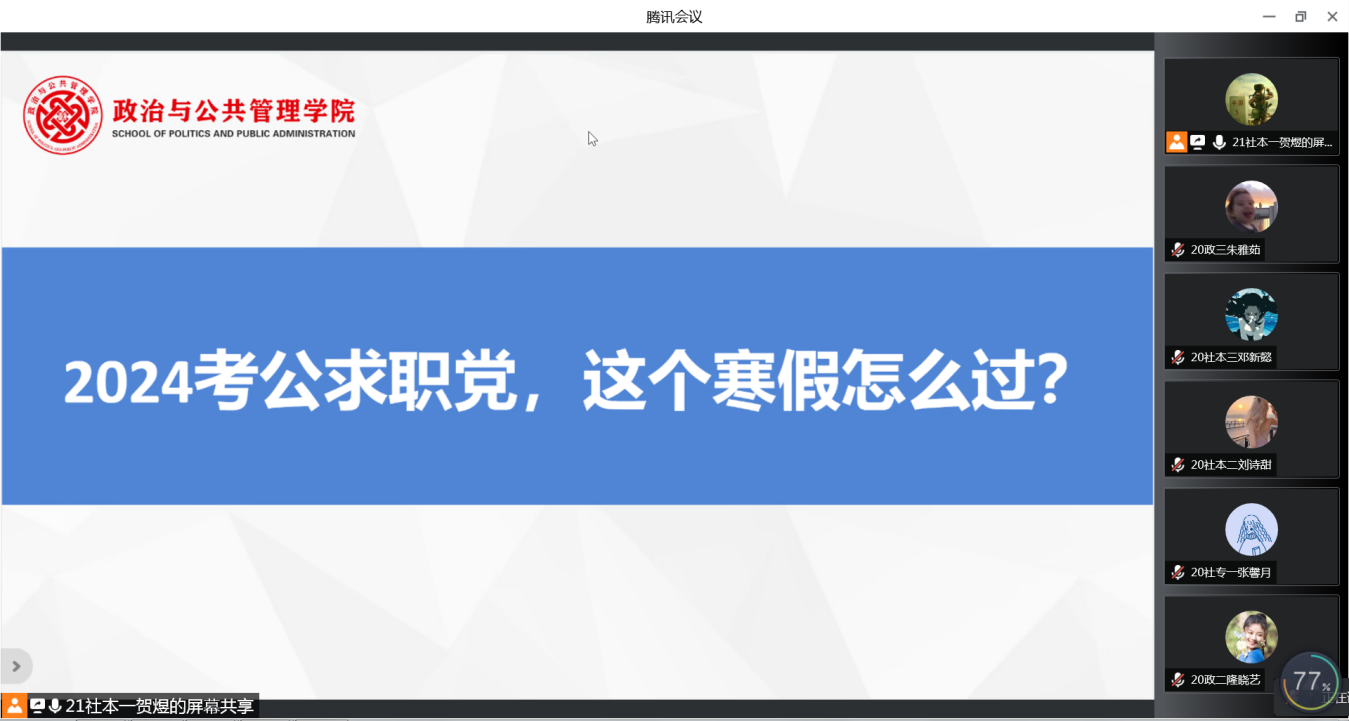为帮助大三学生明确人生发展规划,拓宽就业渠道,进一步了解和掌握未来就业形势,1月17日,政治与公共管理学院邀请2018级优秀毕业生卢怀玉(上岸青州市优选生)、薛文鹏(上岸菏泽市定陶区选调生)、郑超(就职于济南弘阳商业管理有限公司)进行考公求职经验分享,会议由辅导员马千惠主持。