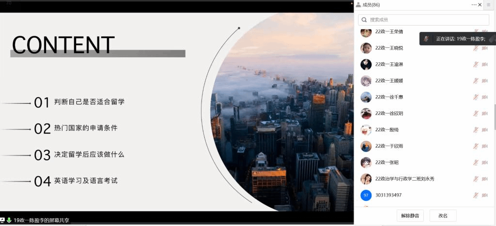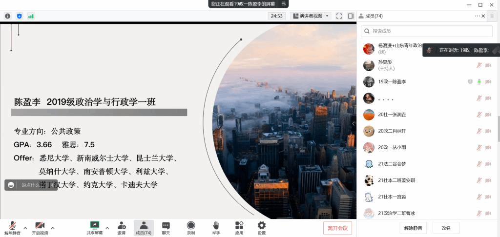 为进一步推动党建促就业,帮助在校学生明确留学情况,了解相关流程与经验,加深学生对出国留学的了解,做好个人的职业规划,近日,政治与公共管理学院邀请2019级政治学与行政学专业陈盈李同学进行留学经验分享,会议由学院主办,学生第一党支部承办,学院学生第一党支部书记、辅导员杨漫漫主持,学院2023届毕业生及部分其他年级同学参加。