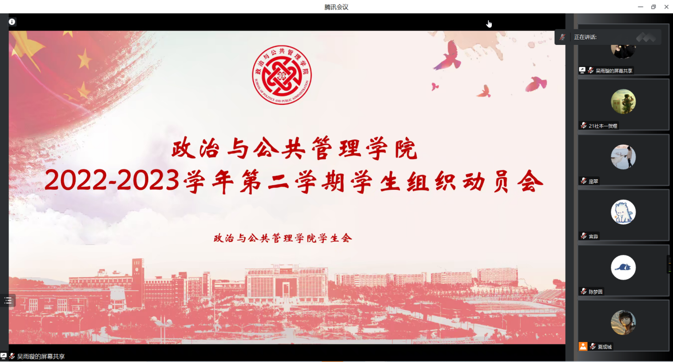 为保证新学期学院学生组织各项工作顺利开展,更好发挥学生组织“信息传递和互动”“打造品牌学生活动”以及“培养青年学生创新能力”的作用,2月12日,政治与公共管理学院于线上召开“2022-2023学年第二学期学生组织动员会”,学院辅导员庞翠、马千惠,学院学生组织骨干成员参会。
