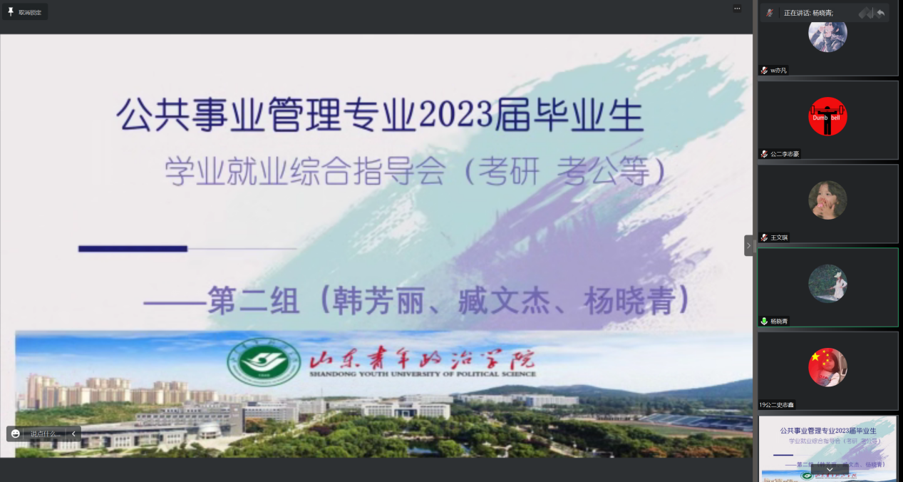 本次学业就业综合指导会有效鼓舞了即将参加考研类复试和公职类考试的学生士气,为毕业生学业就业提供了系统综合的意见建议。下一步,公共事业管理教研室将继续丰富指导形式,围绕考研复试和公职类考试的面试开展系列的线下实战模拟,抓深抓细抓实毕业生就业工作保障,增强就业工作实效,全力推进毕业生升学就业实现新突破。