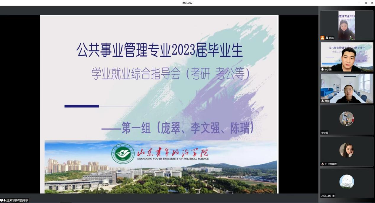 在第一组综合指导会上,庞翠老师结合自身考研经历,为学生如何树立自信,做好复试准备提供了五点指导。李文强老师则围绕考研复试调剂为学生提供了四点建议。最后,陈瑞老师结合近年来公管专业考公情况,以优秀毕业生的典型案例为考公学生提供复习的参考建议。