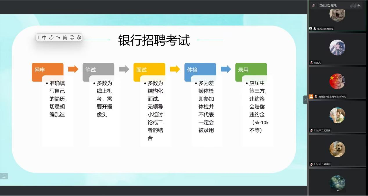 在关于银行招聘考试的讲解中,他为同学们仔细列举并讲述了银行招聘考试中的五个程序的注意事项。在银行的选择问题上,张闯推荐同学们“广撒网”,并在情况允许时尽可能选择国行,并比较了国行与非国行之间的待遇、薪酬、淘汰制度的不同。