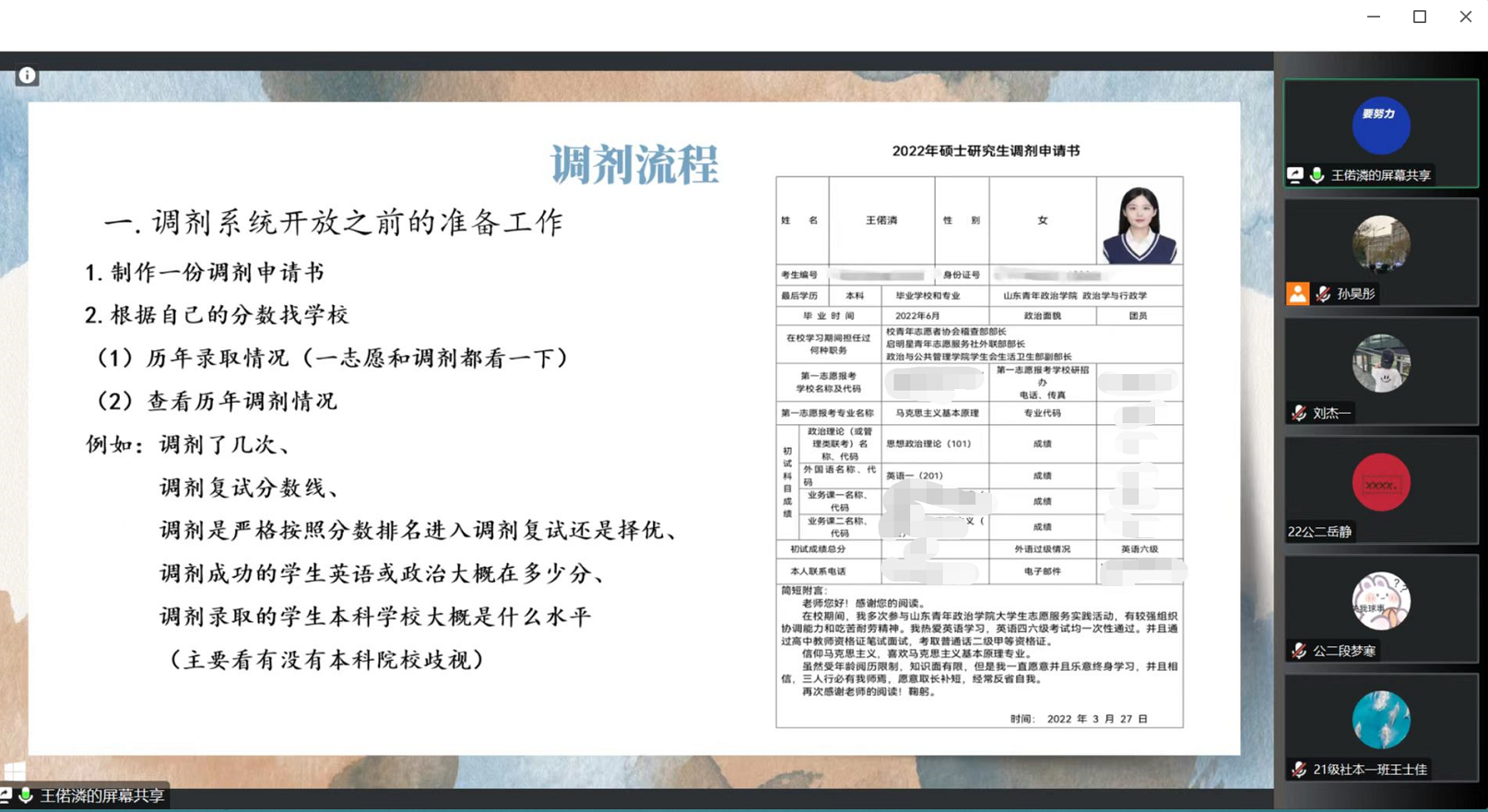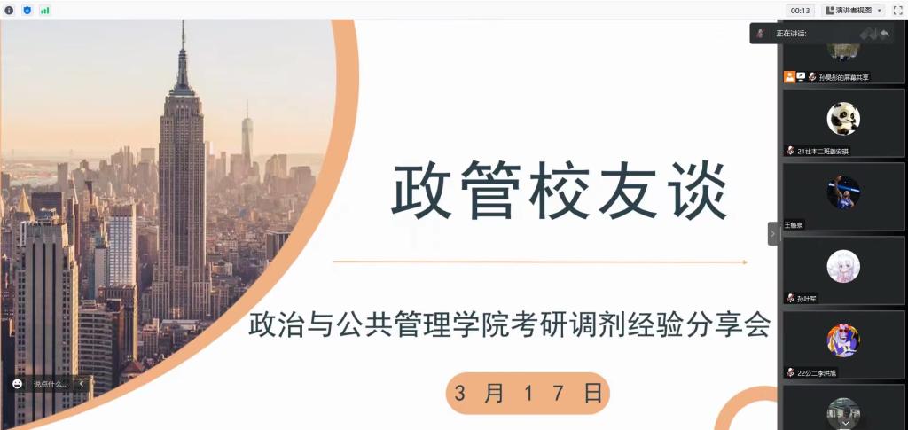 为让考研学子对调剂的相关流程和注意事项有更深入地了解,以更好的精神面貌为即将到来的研究生复试做好准备,帮助同学们把握调剂机会,3月17日,政治与公共管理学院举办了第六期政管校友谈暨优秀毕业生考研调剂经验分享会,本次会议邀请2022届毕业生王偌潾、刘杰一进行经验分享,会议由学院辅导员杨漫漫主持。