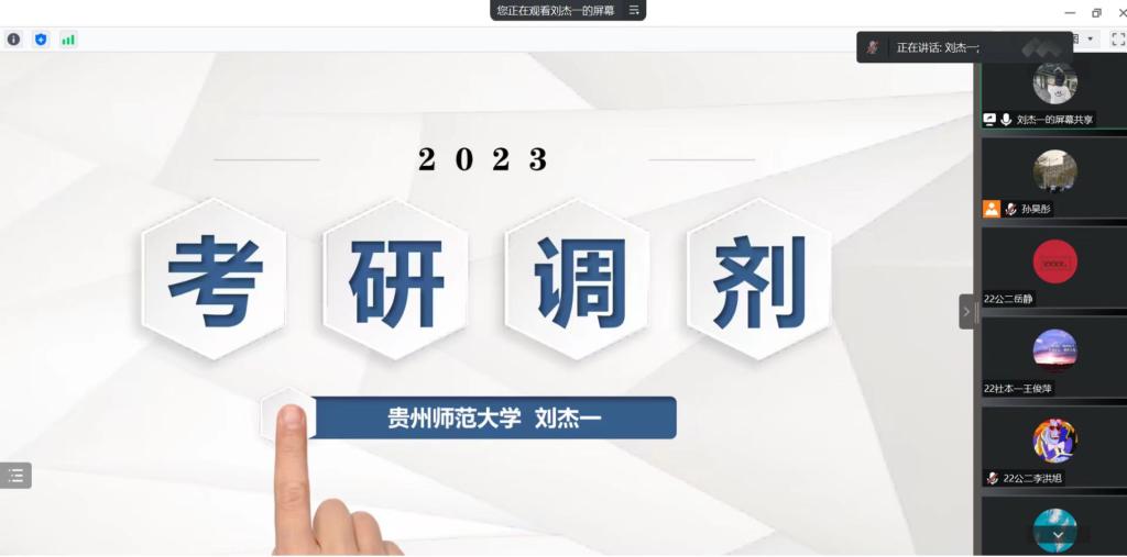 刘杰一同学从考研调剂概述,研招调剂服务,个人调剂经历三个方面进行分享。他将考研情况分成八类,根据不同情况向同学们讲解该如何进行调剂准备,强调要“对症下药”,扎实准备复试,尽力而为,才能做到有条不紊,从容不迫,应对自如。他强调,要及时、准确地把握调剂信息,要丰富调剂信息的搜集途径,把握机会,最大程度减少信息差,并且分享了很多获取信息的途径。最后,他鼓励大家,成功有时候是要经历从失败到失败,只要不改热情,就可能用最后一把钥匙打开门。