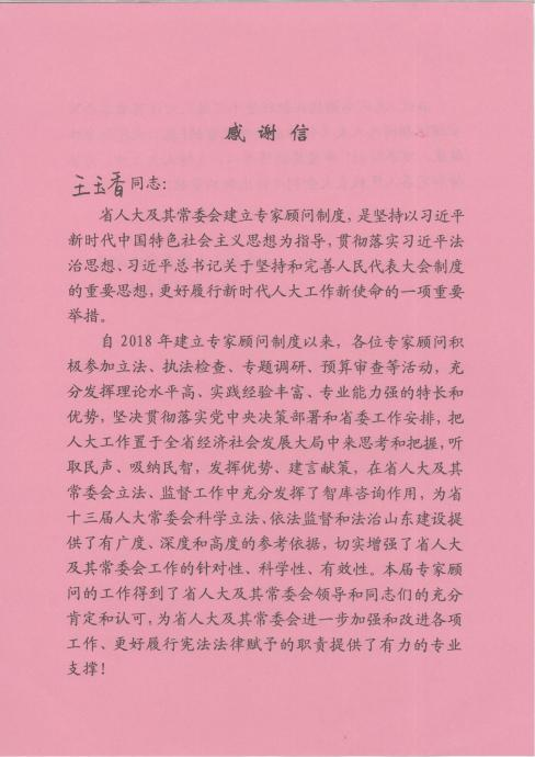 近日,山东省人大常委会办公厅向我校致感谢信,信中对我校政治与公共管理学院院长王玉香教授担任省十三届人大及其常委会专家顾问期间作出的积极贡献给予了充分肯定。信中表示,王玉香教授积极参加立法、专题调研等活动,充分发挥理论水平高、实践经验丰富、专业能力强的特长和优势,把人大工作置于全省经济社会发展大局中来思考和把握,充分发挥了智库咨询作用。