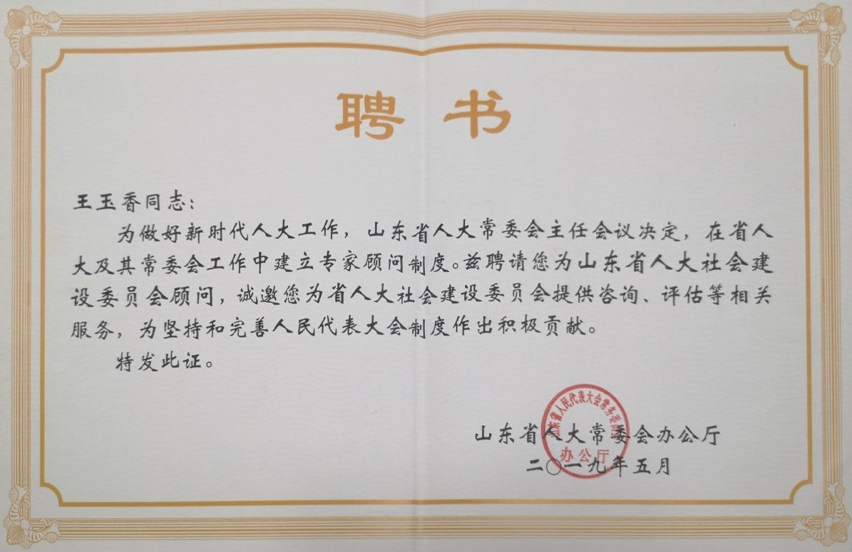据悉,王玉香教授于2018年9月被聘为山东省人大内务司法委员会顾问,2019年5月被聘为山东省人大社会建设委员会顾问,为省十三届人大常委会科学立法、依法监督和法治山东建设提供了有广度、深度和高度的参考依据,切实增强了省人大及其常委会工作的针对性、科学性、有效性。