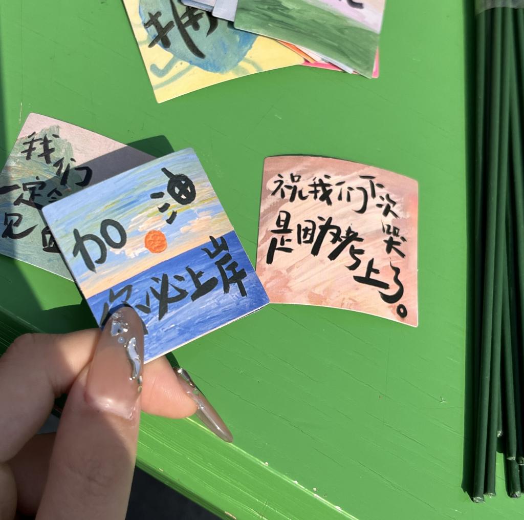 志愿盲盒活动主要由抽取盲盒、完成任务、发放奖励三个环节组成。同学们通过盲盒抽取志愿服务任务,完成摆放桌椅与车辆、制作手工花、捐赠生活用品、分类垃圾等服务活动,任务完成后同学们根据活动贴纸进行登记并换取手工花当做纪念。当一个个身影忙碌在山青校园时,“奉献、友爱、互助、进步”的志愿服务精神也传播到了每一个政管学子的心中。
