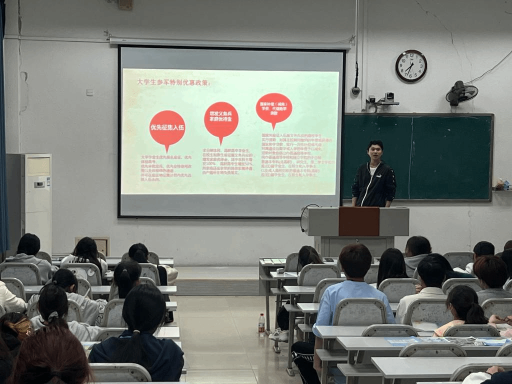 此次活动围绕征兵入伍政策解读展开,主要讲述了应征入伍的报名时间、征集对象范围、征集基本条件、报名方式以及部队发展、升学优先、复学优待、退伍就业、扶持就业等政策保障,使同学们清楚了解到国家以及学校征兵工作的基本情况。