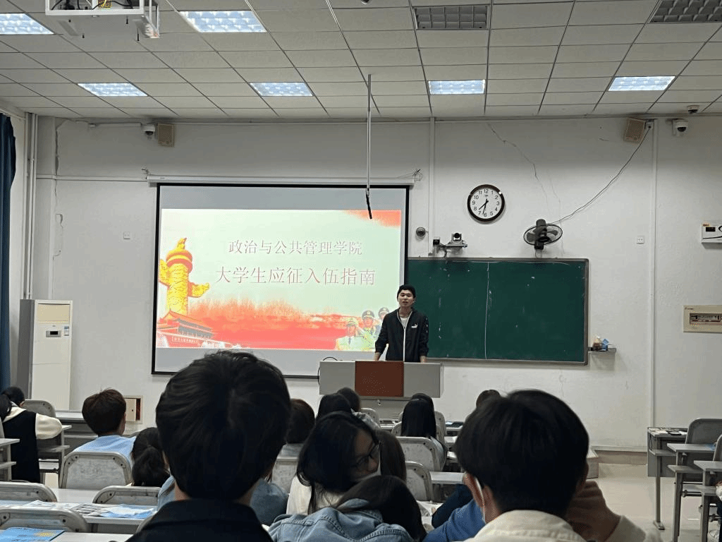 为深入贯彻落实习近平强军思想,进一步深化大学生对新时代征兵工作重要意义的理解和认识,加强征兵政策宣讲力度,提高征兵政策宣讲覆盖面,4月14日,政治与公共管理学院组织开展2023年春季大学生参军入伍政策宣讲活动,征兵宣讲志愿者李秉政主讲。