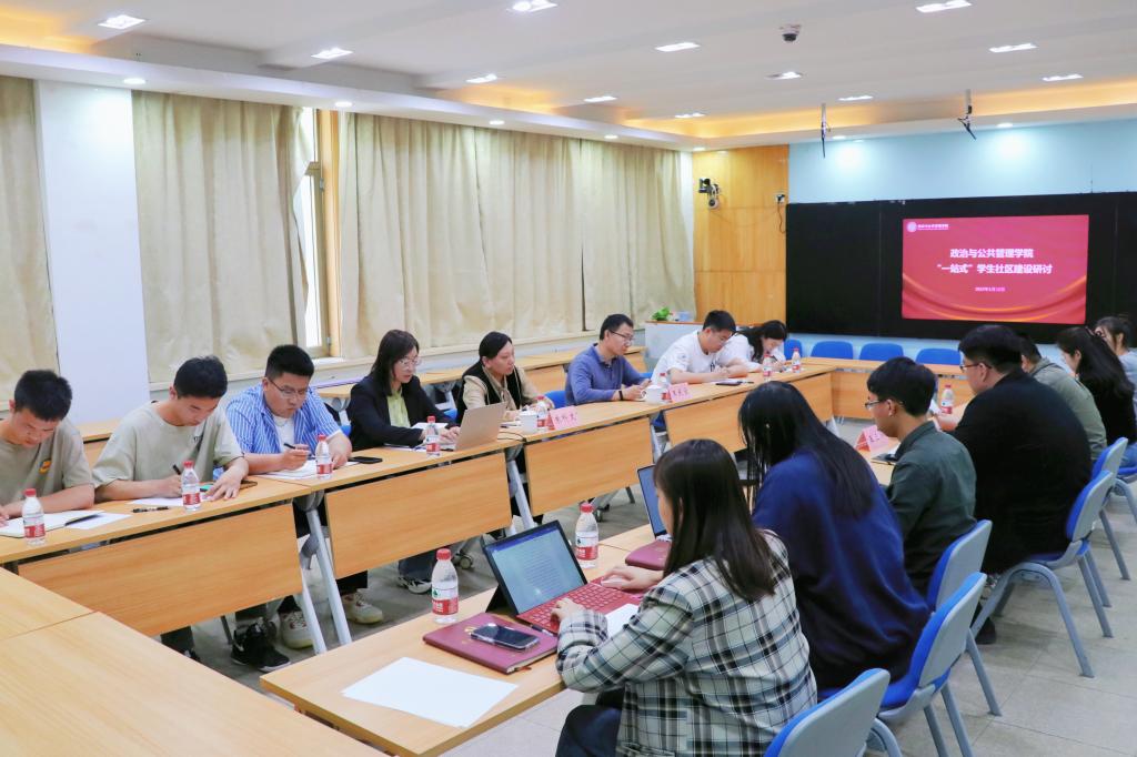 为推动学习贯彻习近平新时代中国特色社会主义思想主题教育走深走实,把调查研究贯穿这次主题教育的全过程,进一步加强高校学生思想政治教育工作,明确“一站式”学生社区的育人目标和育人功能。5月12日,政治与公共管理学院于敏行楼109召开“一站式”学生社区建设研讨会,学生工作部(处)学生公寓管理中心朱科文、王庆宝,政治与公共管理学院党委副书记王正坤、学院全体辅导员、学生代表参加会议。