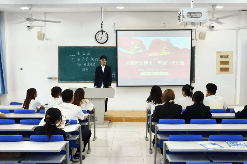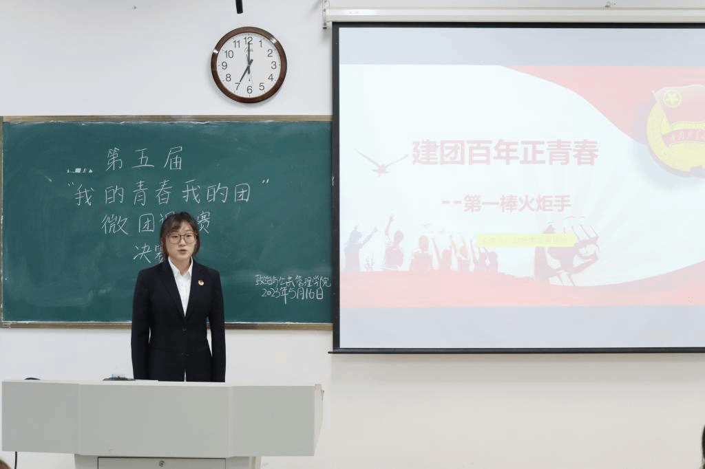 奏响奋进强音,凝神砥砺前行。为深入开展学习贯彻习近平新时代中国特色社会主义思想主题教育,弘扬伟大建党精神,强化团员青年政治品格,赓续红色血脉,夯实精神之本,在纪念五四运动104周年之际,我院于知行楼405教室举办第五届“我的青春我的团”微团课决赛,辅导员王婧和正青春团支部工作研究会骨干成员担任评委,比赛由邓汪洋主持。