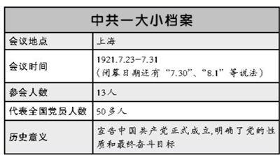 1921年7月23日晚,中国共产党第一次全国代表大会在上海法租界望志路106号(今兴业路76号)正式开幕。出席大会的13名代表,代表着全国50多名党员。陈独秀、李大钊因公务繁忙无法脱身而没有出席。共产国际代表马林和尼克尔斯基出席了会议,并发表了热情讲话。