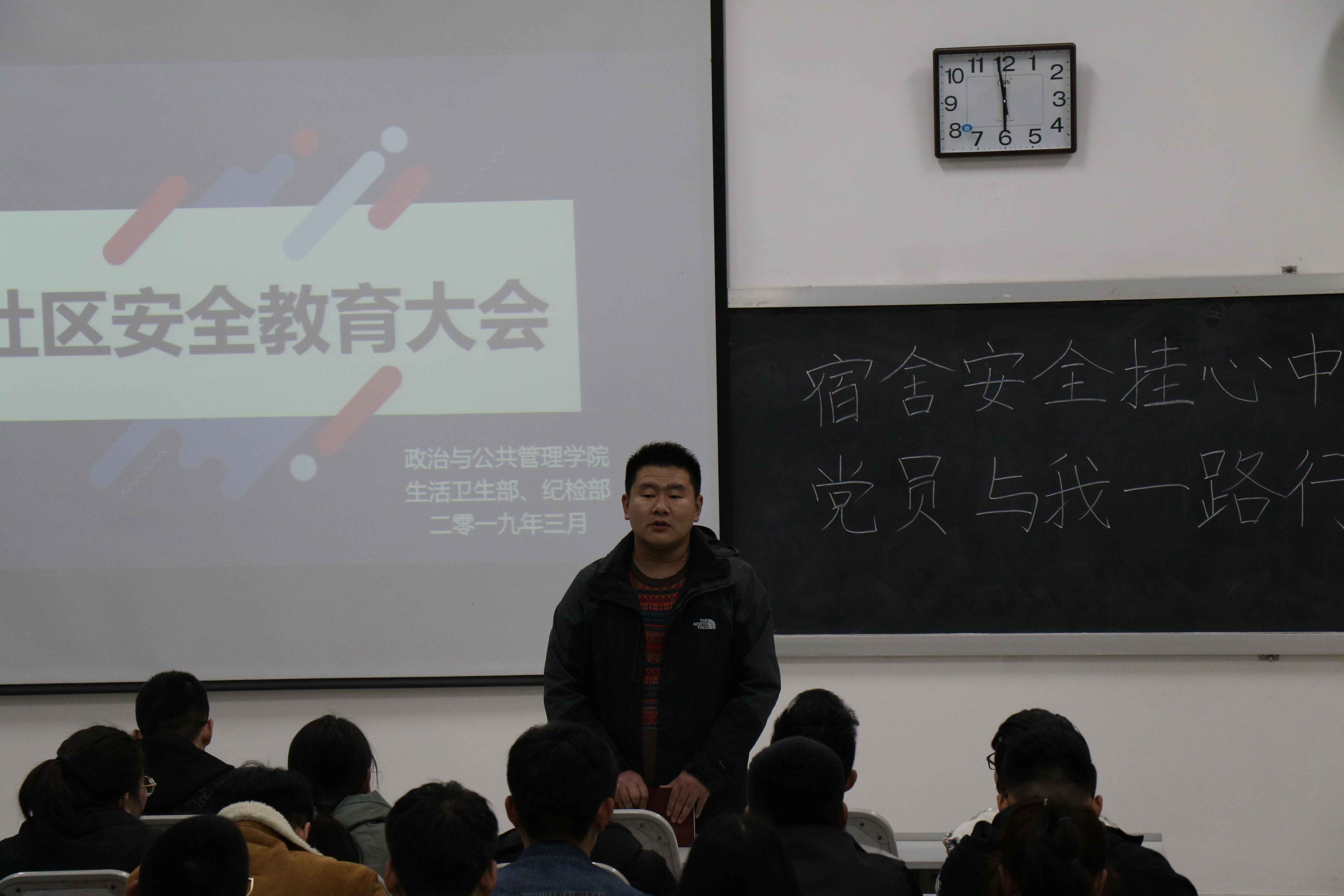 为强调新学期宿舍卫生、纪律、安全等问题,3月4日,政治与公共管理学院于笃行楼209室成功举办主题为“宿舍安全挂心中,党员与我一路行”的社区安全教育大会。政管学院辅导员张明伟与学院各班班长和团支书、各宿舍长参与大会。
