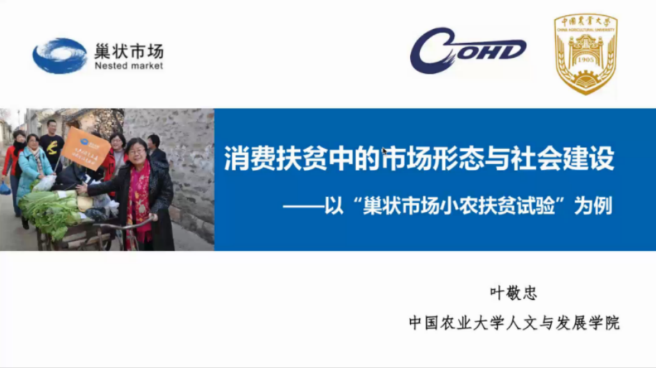 叶敬忠教授首先对我国现阶段精准扶贫的政策设计进行了分析,指出了应用最广泛的产业扶贫与小农户不能较好匹配的问题。叶教授指出,我国扶贫方式可以多元化,不必拘泥于无限大市场的产业扶贫这一种思路,小农经济也有其存在的合理性和必要性。讲演中,叶教授通过图片和视频向我们直观地展示了“巢状市场小农扶贫试验”项目的开展情况及过程,对比了巢状市场小农扶贫与无限市场产业扶贫之间的区别,指出了巢状市场小农扶贫的主要功能。巢状市场小农扶贫以“贫困小农户现在有什么”的生计资源为出发点,以健康农产品和地方特色食物产品的小农式生产为“产业”,以城市普通消费者对健康食物的需求为对接出口,以“巢状市场”为交易和互动的组织形式,是一种有效的扶贫模式。该模式通过农村贫困人口和城市人口的相互信任和共同参与,成功地将生计资源和社会资本转化为贫困人口的收入,实现精准、稳定和可持续的脱贫结果,彰显了创新、协调、绿色和共享的发展理念。最后,叶教授鼓励大家开拓思路,探索长效脱贫机制,并提出指导性建议。