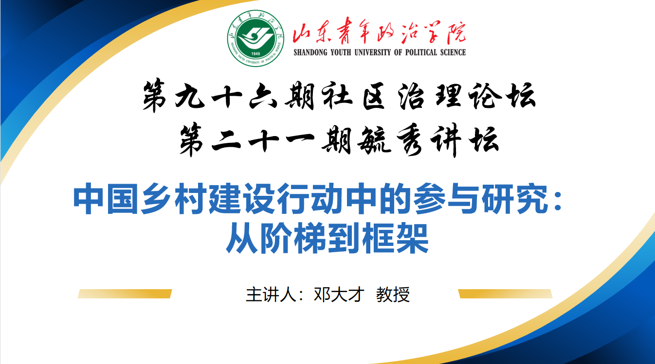 近日,由政治与公共管理学院主办,山东省社区发展与社会工作研究中心、国际问题研究院承办的第九十六期社区治理论坛、第二十一期毓秀讲坛通过腾讯会议系统举办。华中师范大学邓大才教授应邀做了题为《中国乡村建设行动中的参与研究:从阶梯到框架》的学术报告。本次论坛由政治与公共管理学院院长王玉香主持,学院部分师生参加。