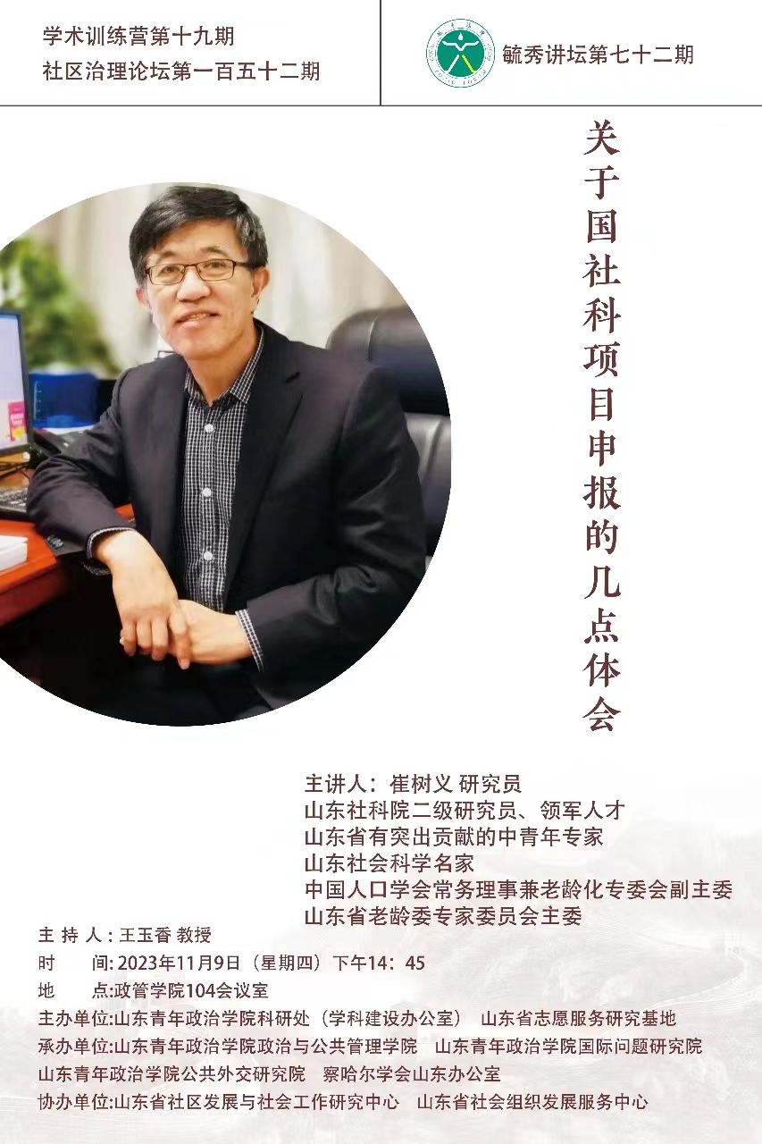 主讲人简介:崔树义,法学博士,主要研究领域为人口社会学。山东社科院二级研究员、领军人才,享受国务院政府特殊津贴专家,山东省有突出贡献的中青年专家,山东社会科学名家,国家和山东省社科基金项目评审专家,山东省社会科学优秀成果奖评审专家,中国人口学会常务理事兼老龄化专委会副主委,山东省老龄委专家委员会主委,斯坦福大学、悉尼大学、利物浦大学访问学者。主持5项国家社科规划项目和10余项省社科规划项目,获得山东省社会科学优秀成果一等奖1项、二等奖4项,在人民出版社、商务印书馆、三联书店出版著作10余部,在《社会学研究》《中国人口科学》《文史哲》等发表论文、研究报告等100余篇;20项研究成果得到山东省及国家卫健委领导肯定性批示。
