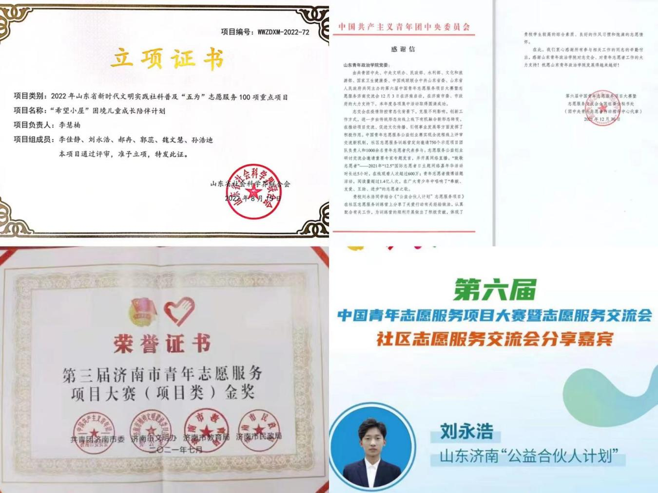 志愿万里,不忘初心;信念如磬,热爱永在。在启明星青年志愿服务社的三年里,刘永浩对志愿服务怀有不泯的热情,从四期公益合伙人计划志愿服务到三次志愿服务大赛,他持之以恒,用身体力行传承雷锋服务人民、助人为乐的奉献精神;精神,用爱心、热心、耐心似春雨润物无声般温暖人心。在不断地吸收、总结与进步中,他坚持策划各色志愿活动:济南市图书馆高校团体文化志愿服务活动,为读者提供一个舒服、安静的阅读环境,打造更加美好的泉城书房,得到服务对象的一致赞扬;“军属陪护-青暖计划”志愿服务活动,组建了军属陪护专项志愿小组,缓解军属的生活压力与负担;“助力优抚·社工同行”活动,采访退役老兵当年在战场上英勇的战斗故事和感人事迹,表达对退役军人的尊重与支持,增强退役老兵的荣誉感与成就感;“希望小屋”困境儿童成长陪伴计划,对学生进行了一对一课业辅导,给予青少年群体足够的关心与帮助……一次次志愿服务中,他与团队成员分工协作,积极联系各方协调、对接工作,在圆满完成志愿服务的同时也提升了自身的综合能力。